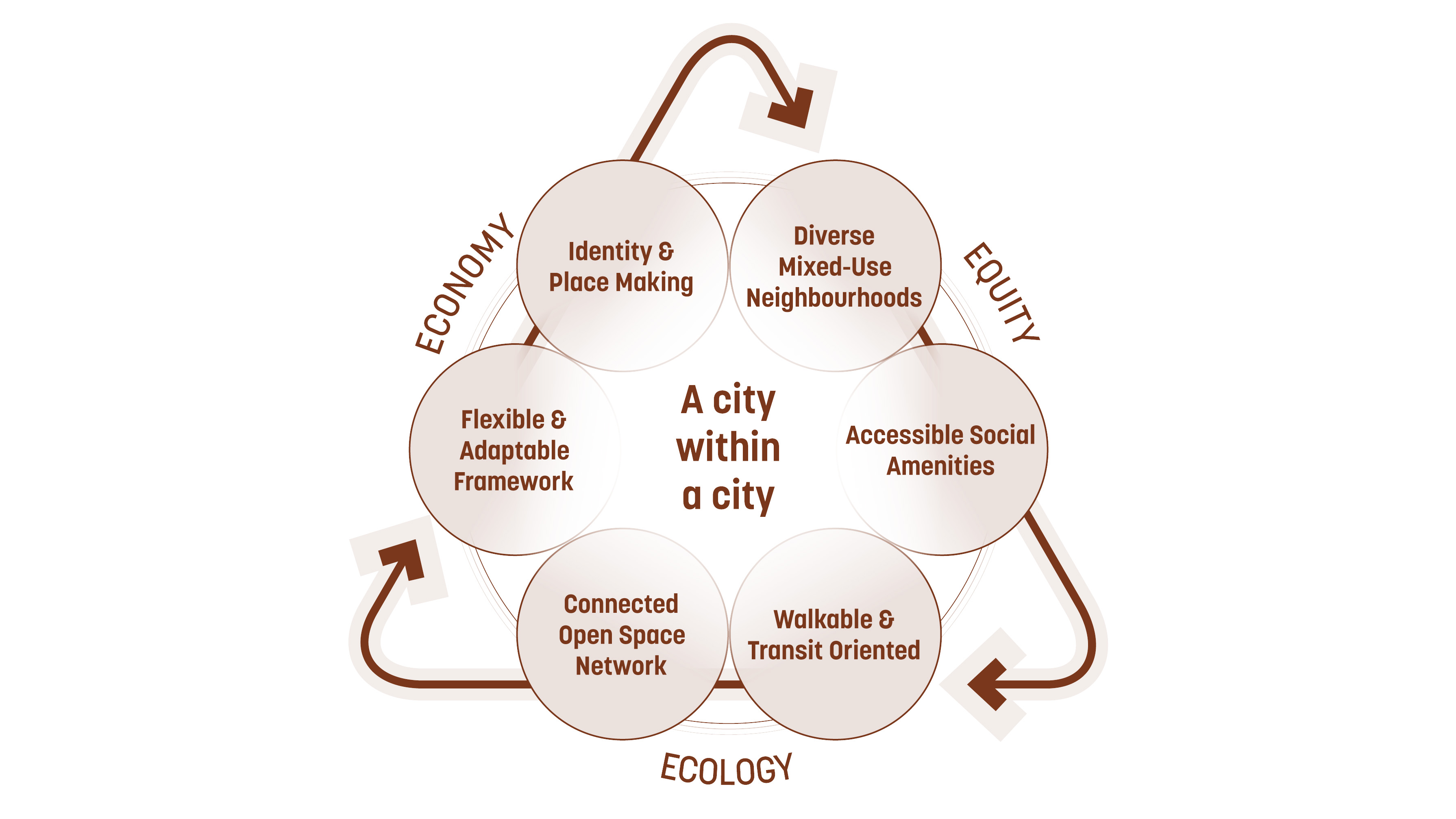 - Urban identity strategy grounded in connectivity, inclusivity, and place-making for a memorable, navigable environment.